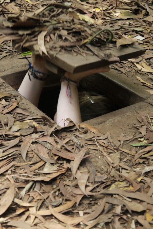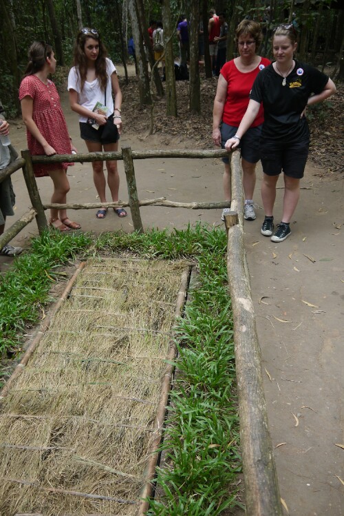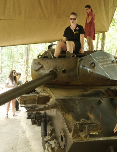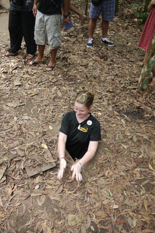 We took a bus trip out to the Cu Chi tunnels. They are a network of tunnels devised by the Viet Cong army covering 200kms underground. It was a hot day and we didn’t have long underground. The entrances and tunnels were very small – designed for the Vietnamese! It was an interesting experience – and not one for claustrophobics!  we crawled 100m, but some of the group bailed after 40m. We also saw some of the dreadful torturing devices that were used. Not for the faint hearted..  On the way we visited a laquer wood factory that employed disabled people. It was an interesting day, led by a young Vietnamese guide who loved his KFC. He did not go underground! His nickname was ‘Panda’.